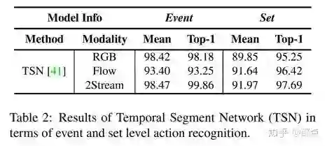 实验分析的主要关注点在最细粒度的元素类别识别。在此之前,我们先简要在较粗糙粒度上(event&set),进行了相关实验和分析。由于粗粒度实验不是重点,我们选取了当前业界广泛应用的方法——TSN,以点带面。实验结果如下: