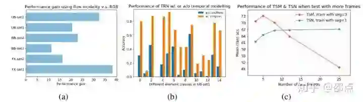 b) TRN学习了帧间关系来建模时域信息,然而一旦将输入的帧的顺序打乱,TRN 的表现将大幅下降。