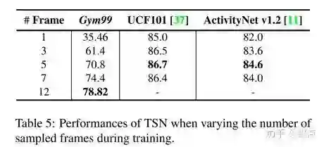 如下面的实验数据所示,在UCF上只用2.7%的采样率(5帧)TSN的识别准确率就达到了饱和,而在FineGym上的元素类别识别则需要采样30%(12帧)以上的数据帧。