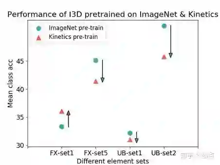 这说明更细粒度的动作识别需要模型的关注点逐渐回到动作本身,而不能通过仅仅学习一些场景和物体信息就能很好地对动作进行分类。这一趋势在元素类别的识别中体现的更加明显。