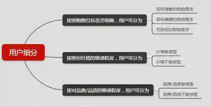 我按照三个维度来划分用户,“购物目标是否明确”、“是否对价格敏感”、“是否对品牌/品质敏感”,具体如下图所示: