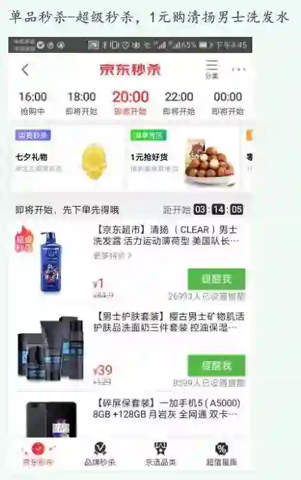 超级秒杀。在高流量场次(如8点、10点、12点、20点、22点),某一单品提供限量超级折扣,如1元购买清扬男士洗发水。