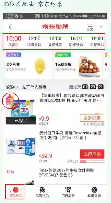 下图中红色圆圈为“超级秒杀”,是京东秒杀特有的一个项目,为用户提供超级折扣。