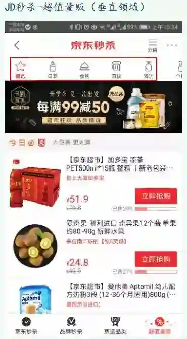 超值量贩本质上为垂直领域的秒杀,分为母婴、食品、酒饮等垂直细分领域。