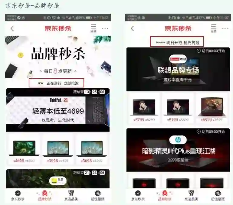 品牌品类秒杀放一整天,但会提前一天预告,有些从8点开始,有些从0点开始。