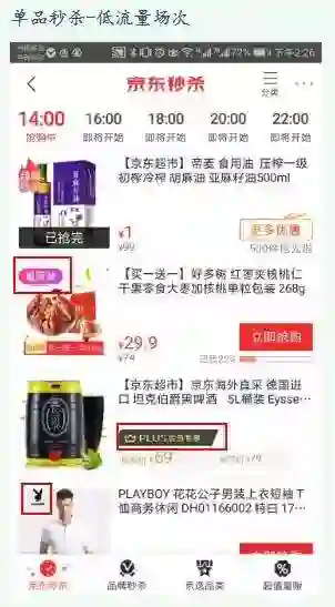 在流量较低的场次,单品秒杀的内容相对较少,补充的内容为其他频道的活动,包括量贩秒杀、品牌秒杀、Plus会员专享等。