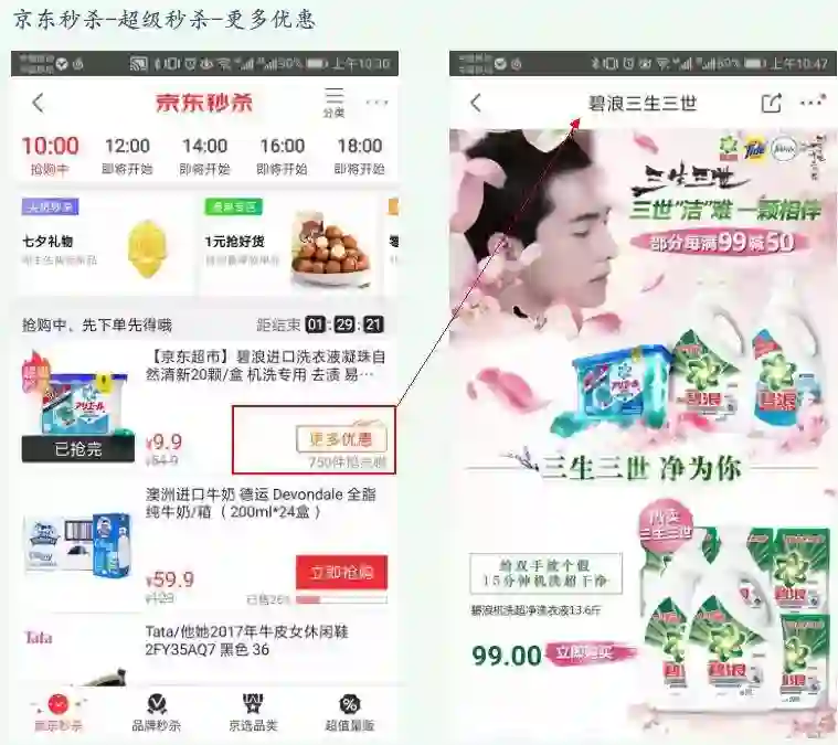 整个过程非常自然顺畅,对洗护用品感兴趣的用户,无论是否抢到“超级秒杀”名额,在点击“更多优惠”后都能进入洗护用品的优惠区,优价挑选自己想要的产品。