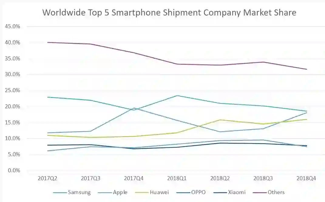 全球五大手机厂商2017至2018年市场份额(来源:IDC数据)