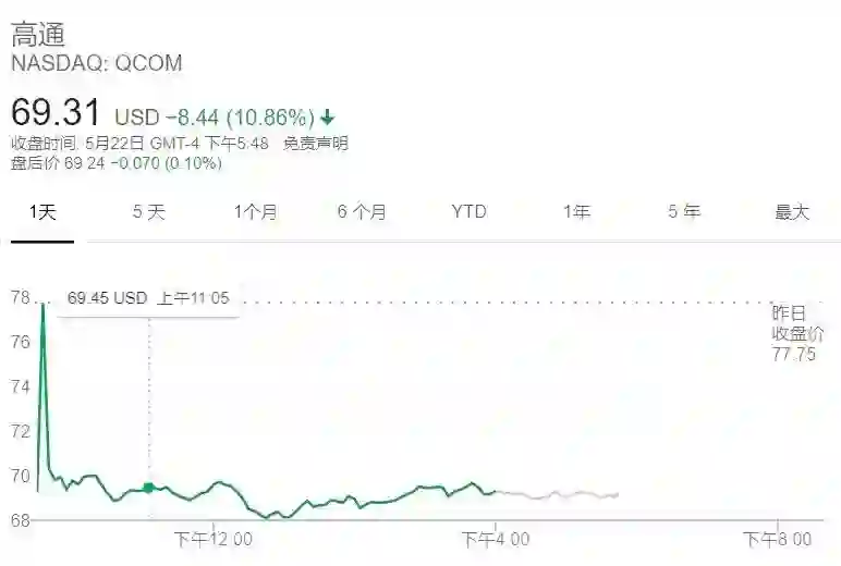 截止收盘,高通股价下跌超过10%(来源:谷歌)