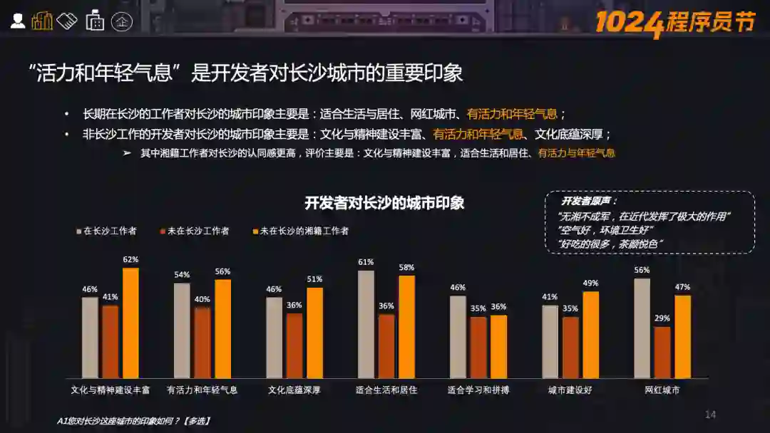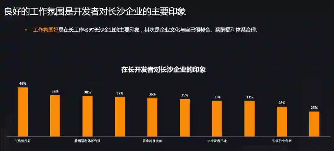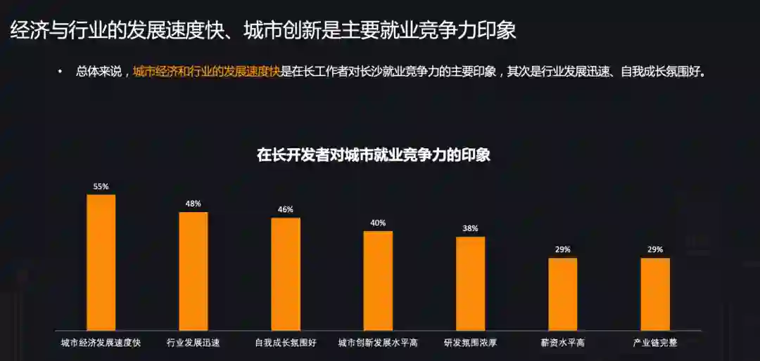 报告显示,多数开发者对长沙就业竞争力的印象为“城市发展快、自我成长氛围好、城市创新高”等。也有部分开发者认为在新一线城市、尤其是中部城市中,长沙的薪资水平和产业链处于较领先的地位。