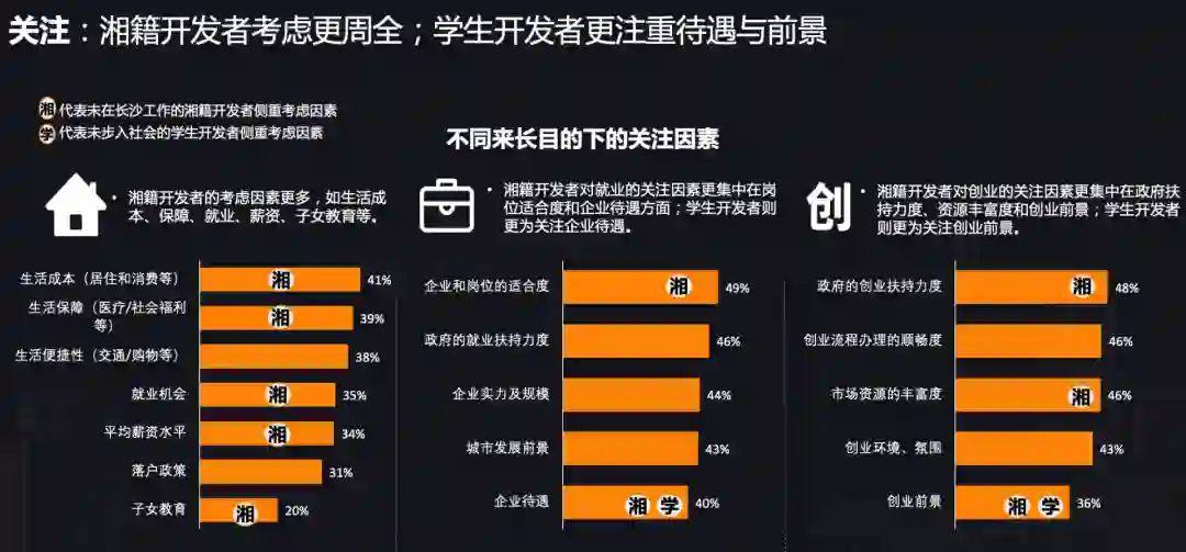 此外,湘籍开发者比非湘藉开发者的考量综合性更强,在生活成本、薪资水平、就业机会、子女教育等方面会比普通学生开发者更加关注。