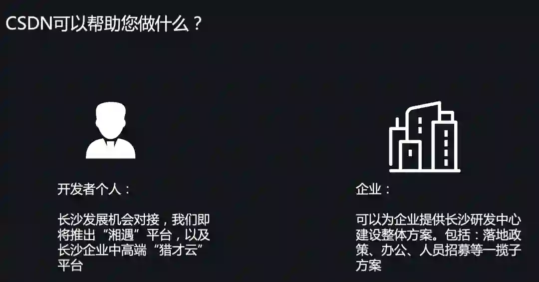 另一方面,CSDN 也会提供完整的服务方案,帮助企业在长沙建立研发中心,包括政策落地、办公场地的协调、人员招募、员工培训在内的一揽子解决方案。