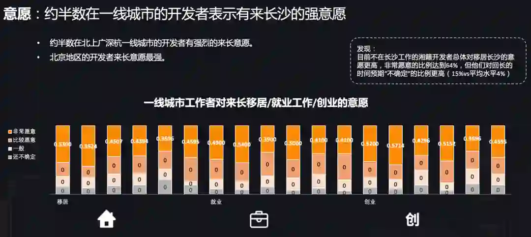 报告发现,约半数在北上广深杭等城市的开发者表示出了强烈的来长意愿,其中北京地区来长沙发展的意愿最强。