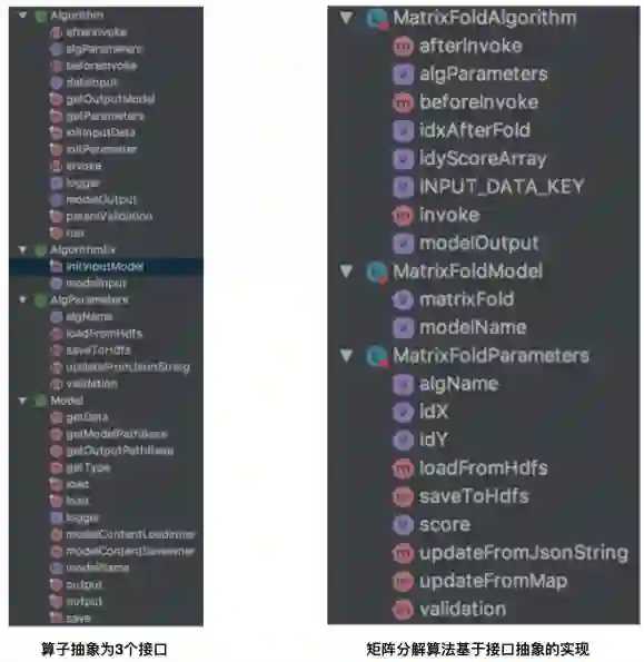 算法组件:这个是整个推荐系统的核心。在工程实现过程中,我们将推荐系统中涉及到的算子抽象为3个接口, AlgParameters(算子依赖的参数集合)、 Algorithm/AlgorithmEx (具体的算法实现,如果算法依赖模型,采用AlgorithmEx,比如利用模型做推断)、Model(算法训练后的模型,包括模型的导入、导出等接口)。所有的算子实现实现上面3个接口的抽象方法。下图给出了这3个接口包含的具体方法以及Spark mllib中的矩阵分解基于该抽象的实现。