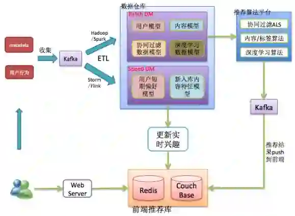 推荐系统在实际业务实现时一般是T+1推荐(每天更新一次推荐,今天利用昨天之前的数据计算用户的推荐结果),随着移动互联网的深入发展,特别是今日头条和快手等新闻,短视频APP的流行,越来越多的公司将T+1和实时策略相结合(比如采用流行的lambda架构,下图是一个采用lambda架构的推荐架构图,供参考)将推荐系统做到了近实时推荐,根据用户的兴趣变化实时为用户提供个性化推荐。像新闻、短视频这类满足用户碎片化时间需求的产品,做到实时个性化可以极大提升用户体验,这样可以更好地满足用户需求,提升用户在产品的停留时间。这里我们只是简单的介绍了一下实时个性化推荐,我在后续的系列文章中会详细讲解实时推荐系统。