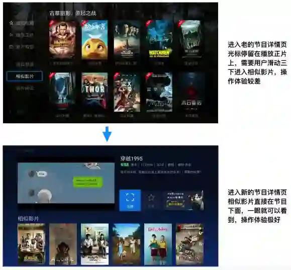 当用户浏览一个电影时,可以通过关联相似的电影,为用户提供更多的选择空间(下图就是电视猫电影详情页关联的相似影片);还可以当用户播放一个节目退出时,推荐用户可能还喜欢的其他节目;针对短视频,可以将相似节目做成连播推荐列表,用户播放当前节目直接连播相似节目,提升节目分发和用户体验;