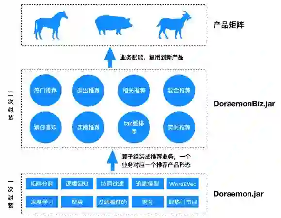 另外,如果公司做产品线的拓展,比如今日头条拓展新产品抖音、西瓜视频、火山小视频等,可以基于上面所提到的“推荐算法的范式”实现很多推荐业务(比如猜你喜欢、相似影片、热门推荐等),将这些业务封装到一个DoraemonBiz.jar的jar包,这样这些能力可以直接平移到新的产品线,赋能新业务。这种操作就是二次封装,具有极大的威力,下面给一个形象的图示来说明这种二次赋能的逻辑,让大家更好理解这种思想。