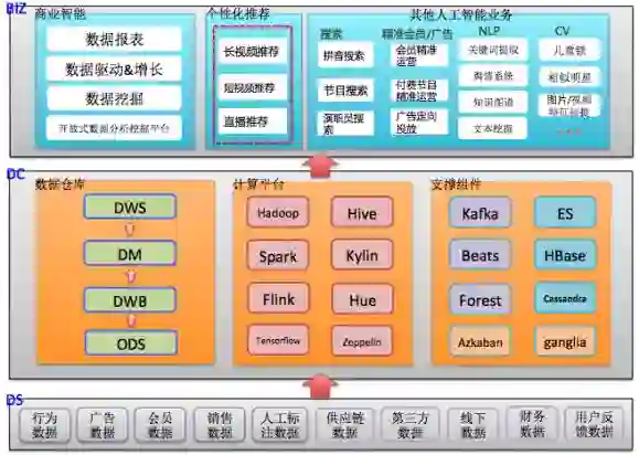 大数据与人工智能具有千丝万缕的关系,互联网公司一般会构建自己的大数据与人工智能团队,构建大数据基础平台,基于大数据平台构建上层业务,包括商业智能(BI),推荐系统及其他人工智能业务,下图是典型的基于开源技术的视频互联网公司大数据与人工智能业务及相关的底层大数据支撑技术。