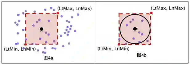 先用矩形框过滤(图4a),判断一个点在矩形框内很简单,只要进行两次判断(LtMin<lat<LtMax; LnMin<lng<LnMax),落在矩形框内的POI个数为n(n<<40万);