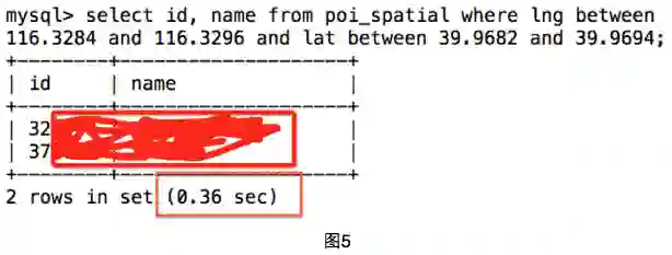 根据这个思路我们执行SQl查询(图5)(注:经度或纬度每隔0.001度,距离相差约100米,由此推算出矩形左下角和右上角坐标),发现过滤后正好剩下两个POI。