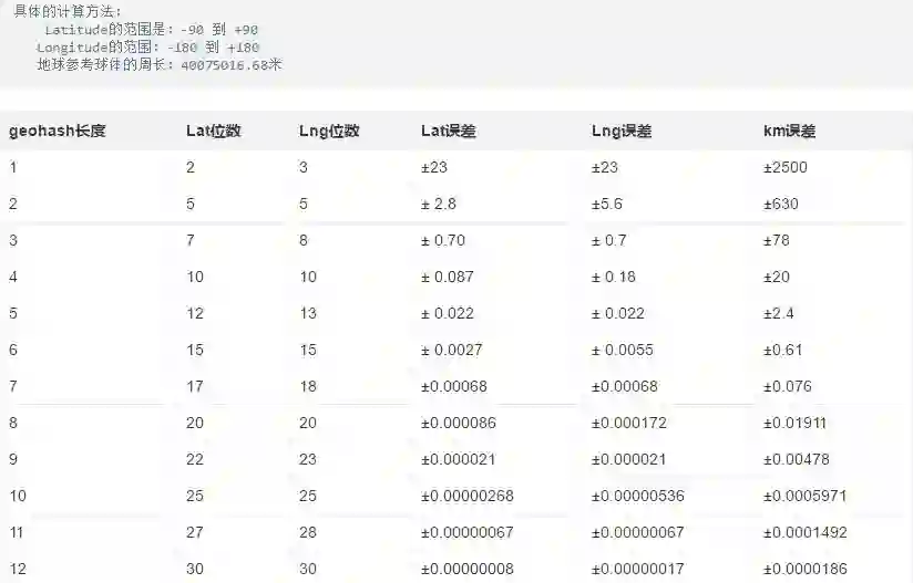 可以看出,当geohash base32编码长度为8时,精度在19米左右,而当编码长度为9时,精度在2米左右,编码长度需要根据数据情况进行选择。