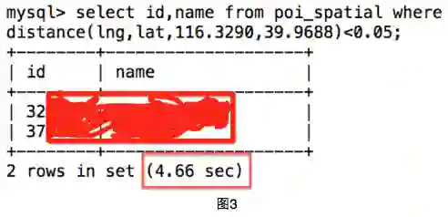 该方法的复杂度为:40万*距离函数。我们将球体距离函数写为mysql存储过程distance,之后我们执行查询操作(图3),发现花费了4.66秒。