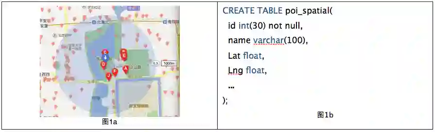 如何根据自己所在位置查询来查询附近50米的POI(point of interest,比如商家、景点等)呢(图1a)?