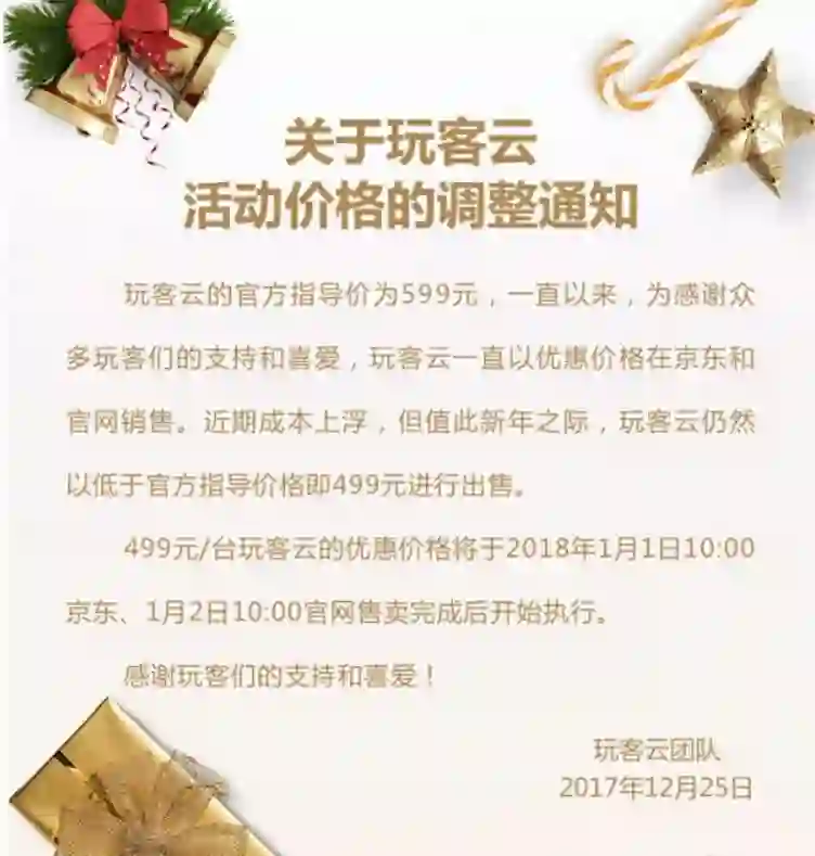 IT之家消息,12月25日消息,迅雷玩客云发布关于玩客云活动价格的调整通知,官方表示,玩客云的官方指导价为599元,近期成本上浮,499元/台玩客云的优惠价格将于2018年1月1日10:00京东、1月2日10:00官网售卖完成后开始执行。