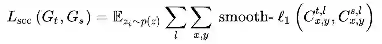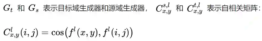 fl 表示第 l 层的特征图, fl(x, y) 表示一个 c 维向量,计算不同位置与(x,y)之间的余弦相似度,相当于记录下了feature中各个位置之间的距离和相关性,对源域生成器和目标域生成器之间的自相关矩阵进行约束,可以实现将源域的结构适配到目标域的目的。