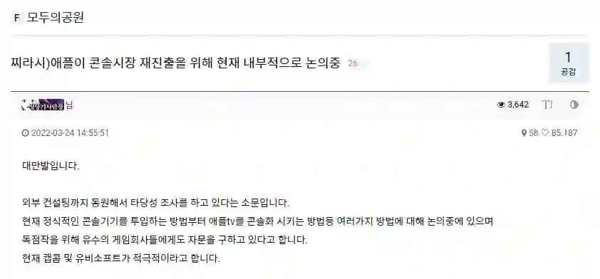 有传言称,苹果将重返游戏机市场,在 Clien 论坛上有爆料者表示,中国台湾供应链中传出苹果考虑重返游戏行业的消息,该公司正在借助外部咨询管理有关人员进行可行性研究。