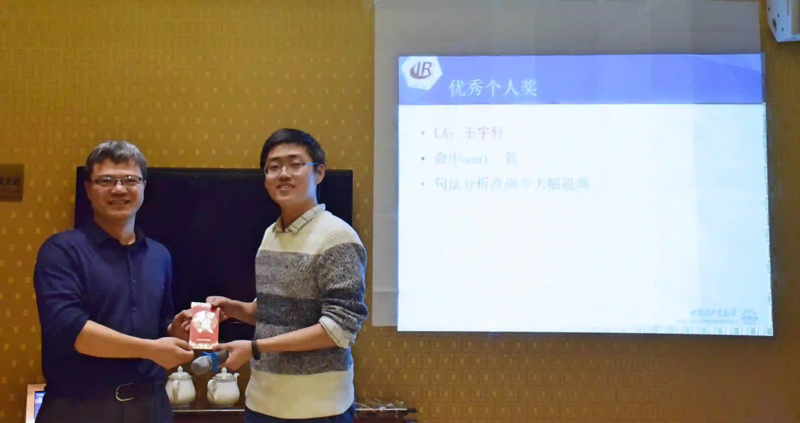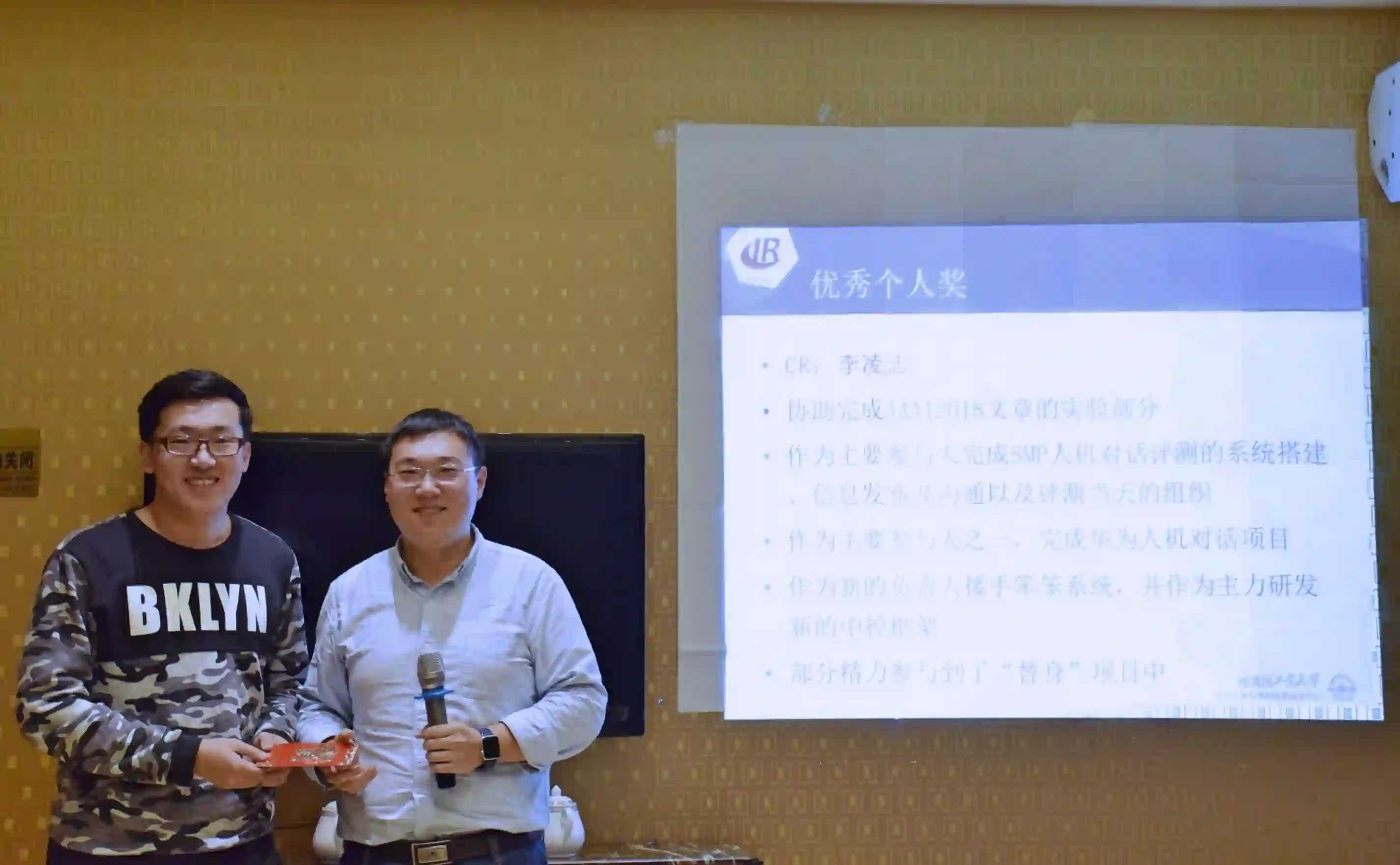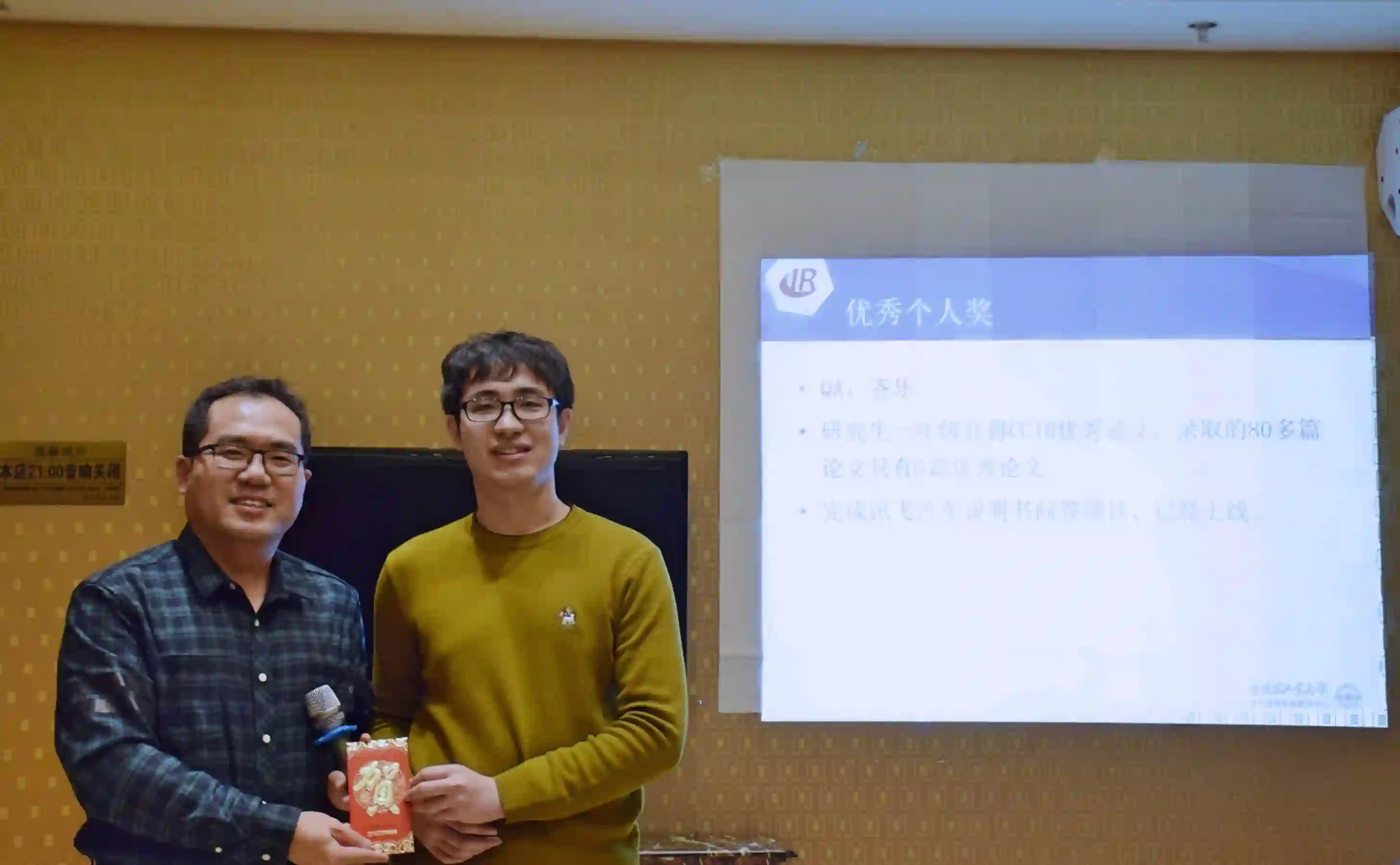 紧接着,颁发2017年度优秀个人奖。各研究组组长综合组内学生在过去一年的表现,对成绩尤为突出的同学进行表彰和奖励,并由各位老师为获奖同学颁奖。今年增设了个性化奖励,为那些对实验室做出积极贡献的同学进行表彰和奖励,并由中心副主任秦兵教授亲自颁奖。