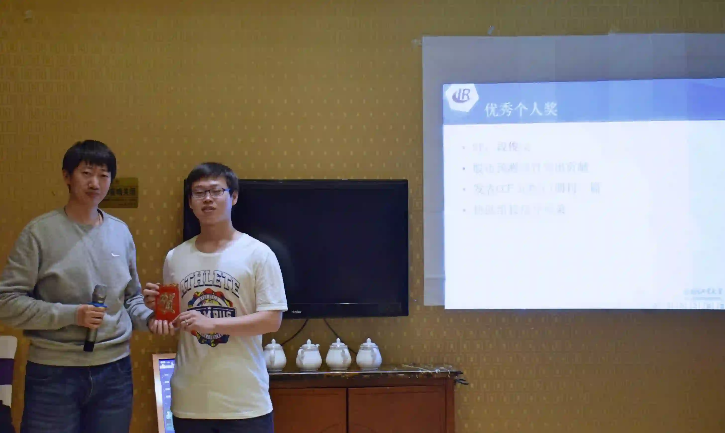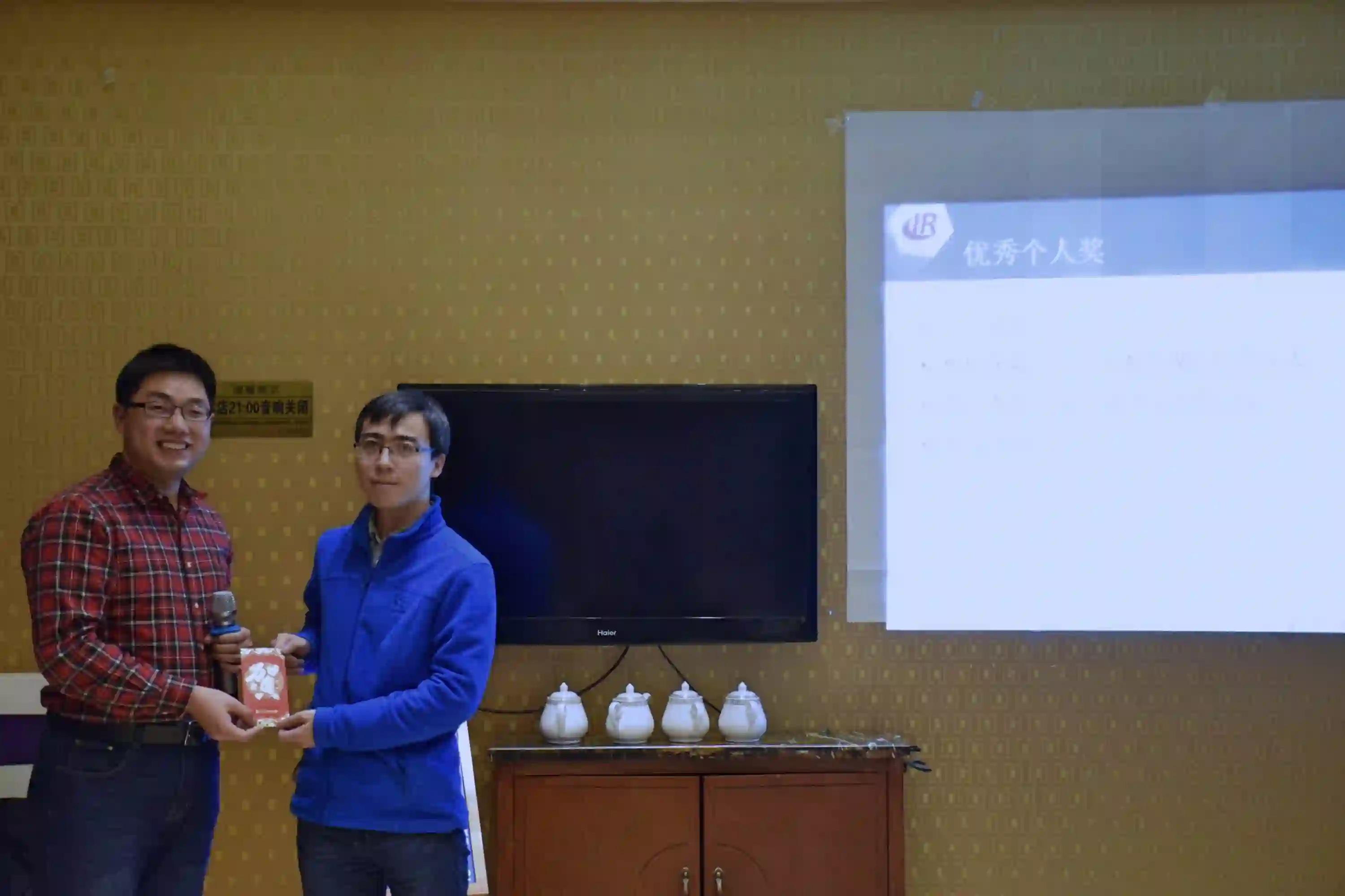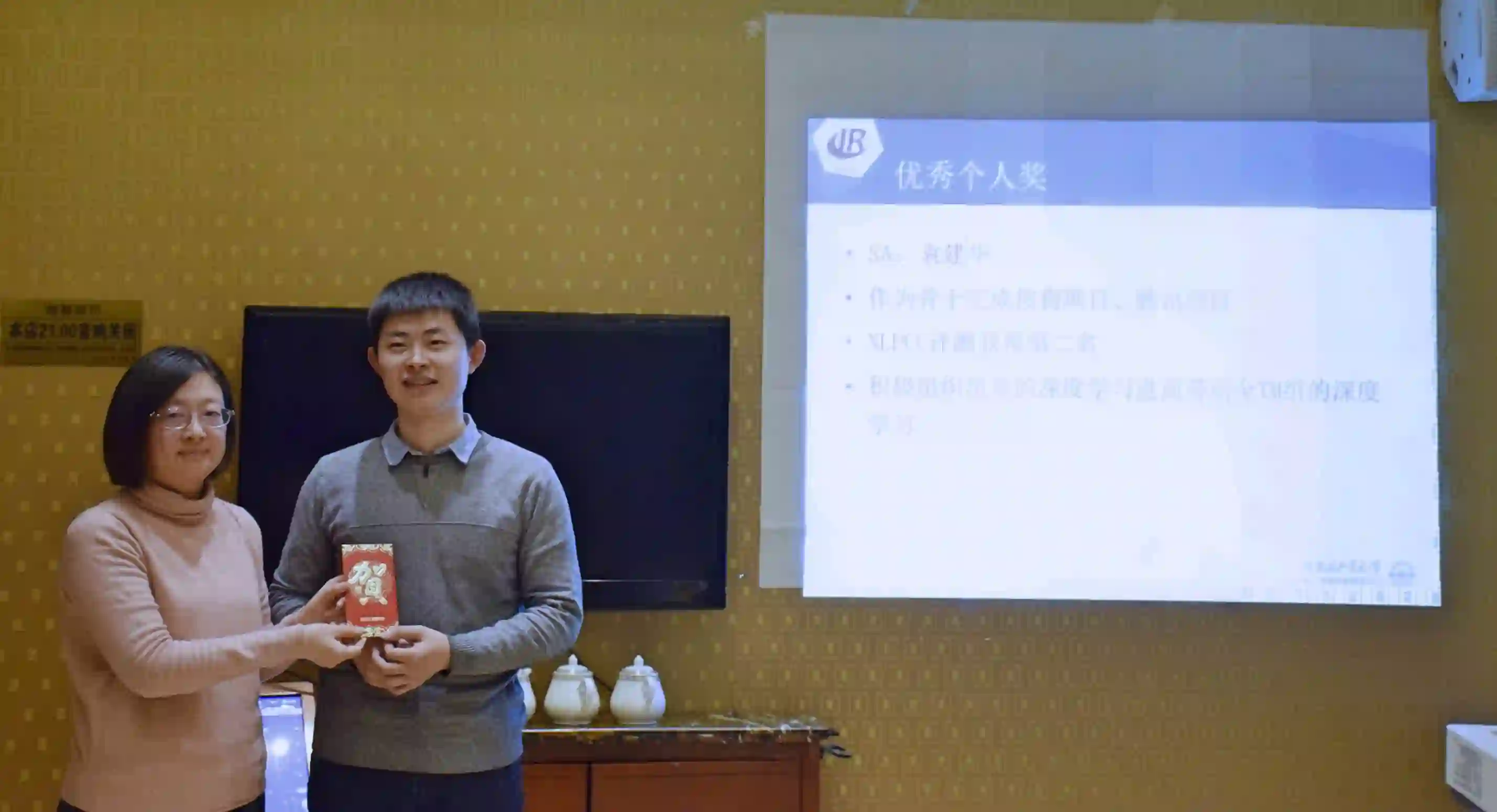 紧接着,颁发2017年度优秀个人奖。各研究组组长综合组内学生在过去一年的表现,对成绩尤为突出的同学进行表彰和奖励,并由各位老师为获奖同学颁奖。今年增设了个性化奖励,为那些对实验室做出积极贡献的同学进行表彰和奖励,并由中心副主任秦兵教授亲自颁奖。