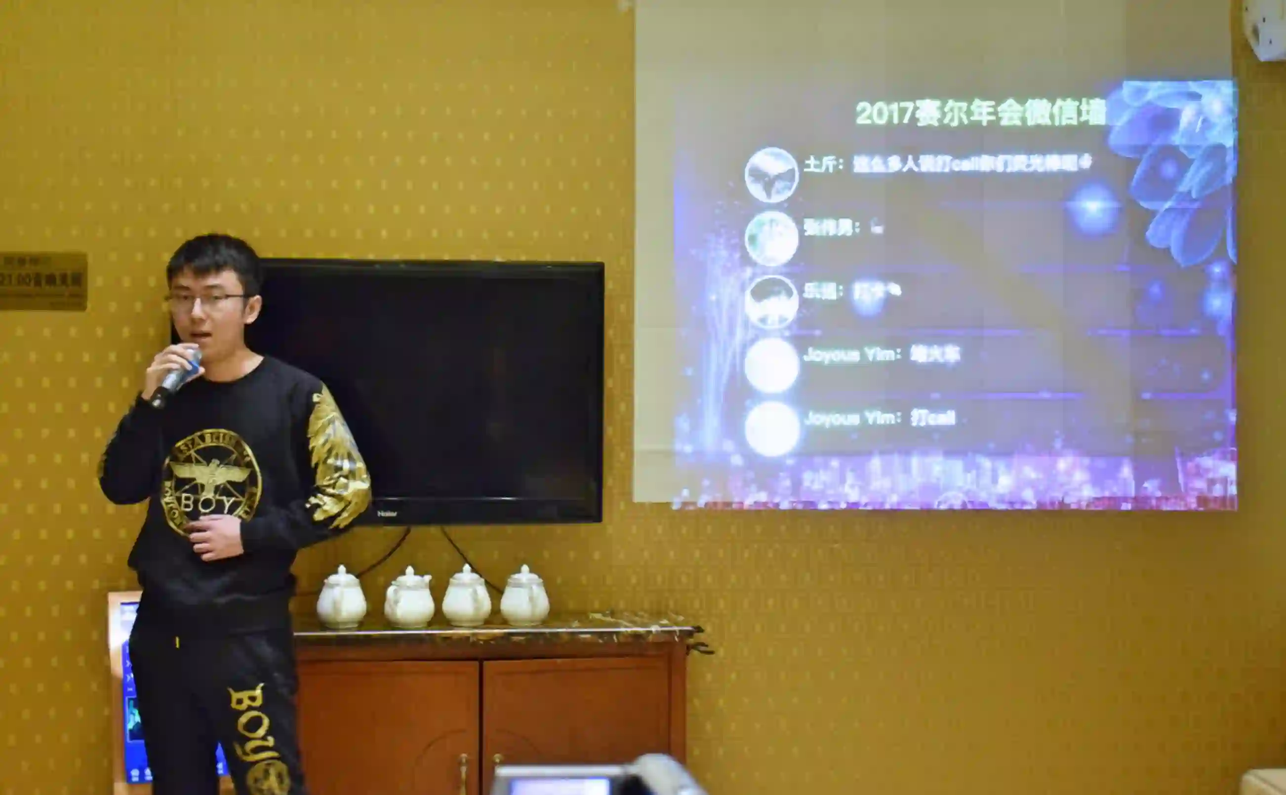 12月27日晚17:00,哈工大社会计算与信息检索研究中心迎新年联欢晚会在满汉楼2楼盛大开幕。鸡鸣声声,送走2017年;犬吠阵阵,迎来2018年。我们在这岁末年初欢聚一堂,回顾一年的奋斗与收获,展望新一年的计划与期待。此外,本场晚会采用在线直播和留言墙的方式与未参会的赛尔师生互动,共度这一美妙的夜晚。