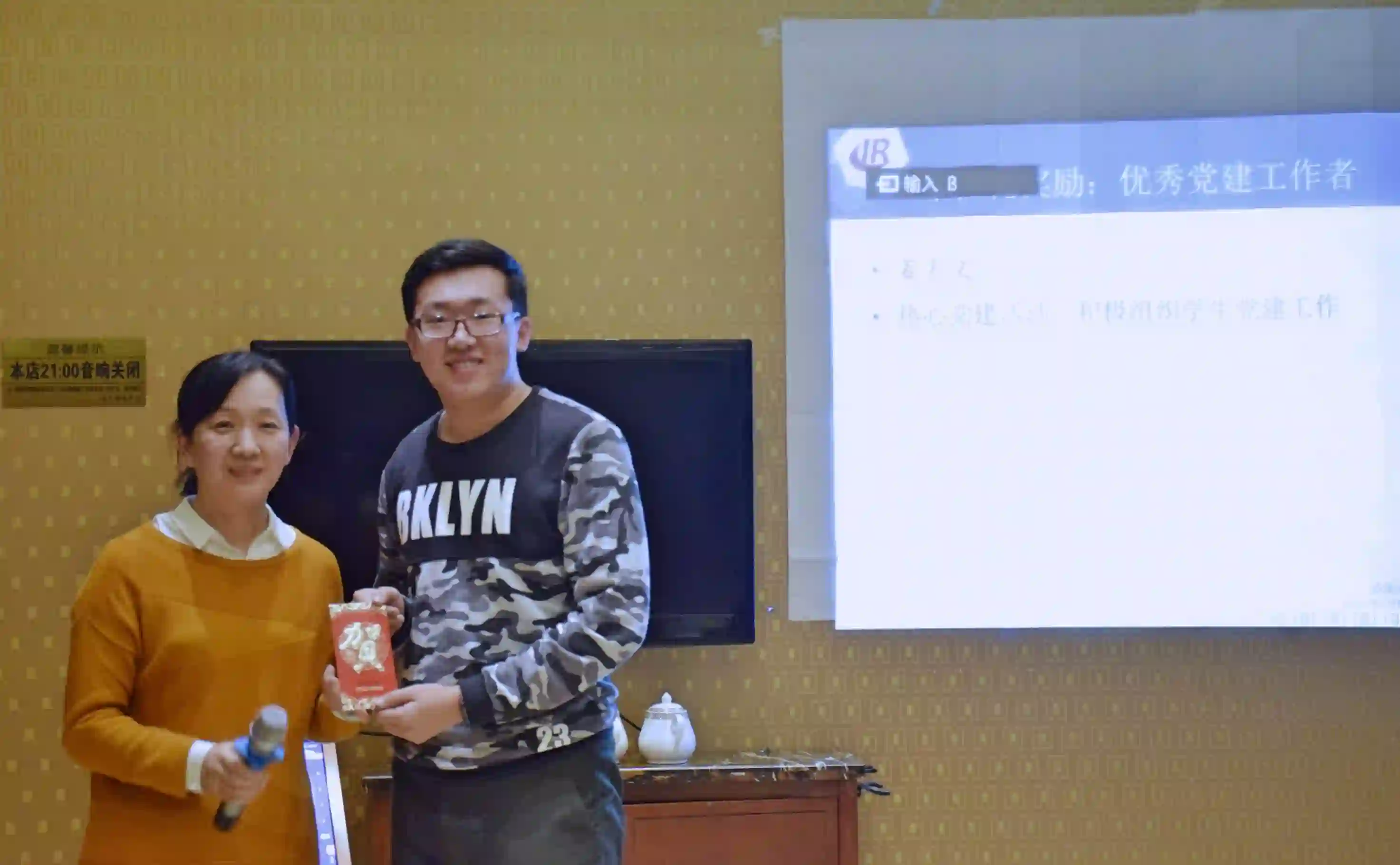图8:丁效老师与李忠阳同学(代段俊文同学领奖)