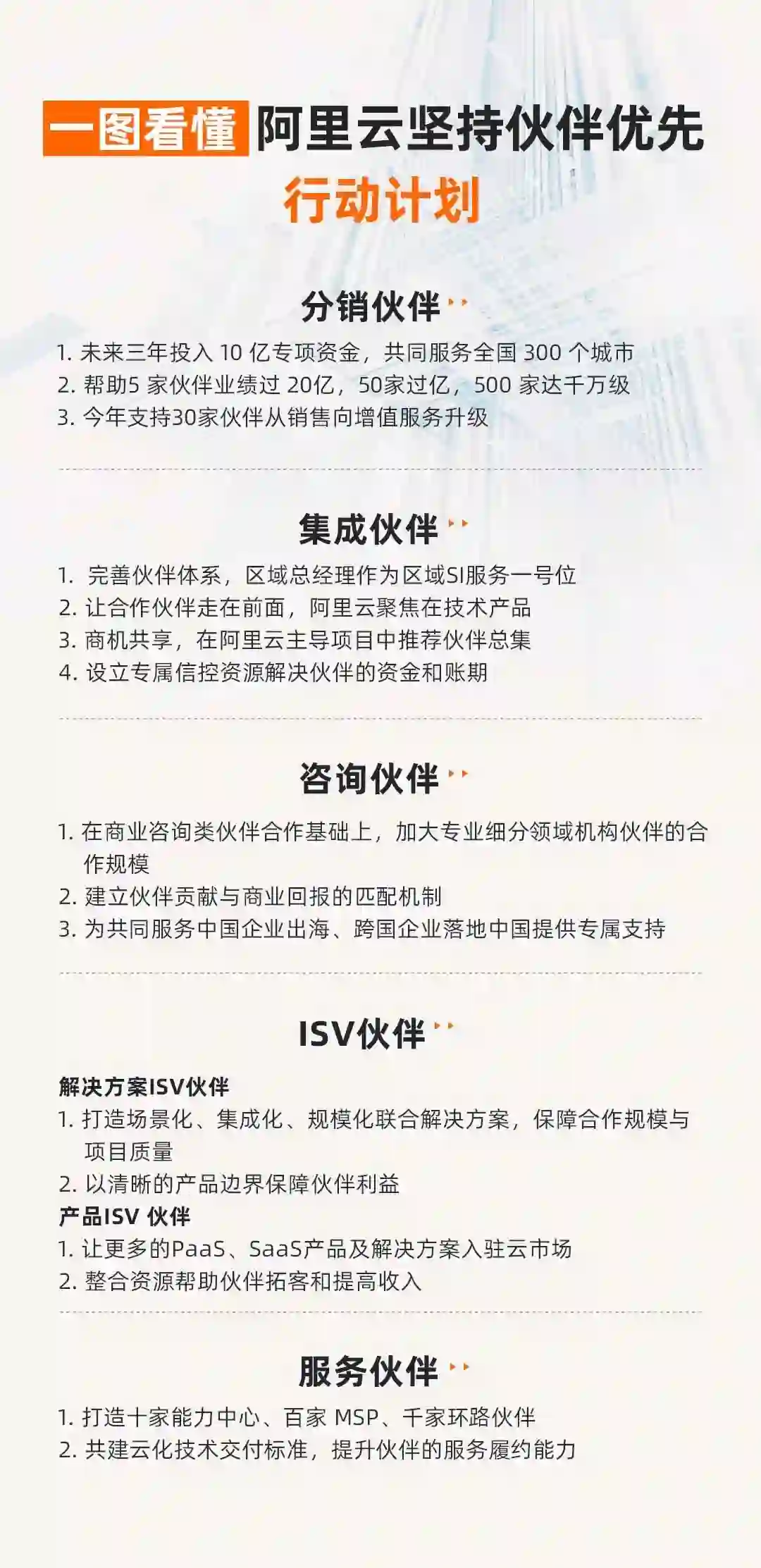 “这些细则设计得既专业又有人情味。”一位资深的行业观察者举例说,在面向总集伙伴时,阿里云提出要在自己主导的项目中推荐伙伴总集,并设立专项信控资源,解决伙伴的资金和账期问题。“因为一些大型项目动辄要一两年,业内曾经出现过项目还没结束,合作伙伴已被资金拖垮的事件。”