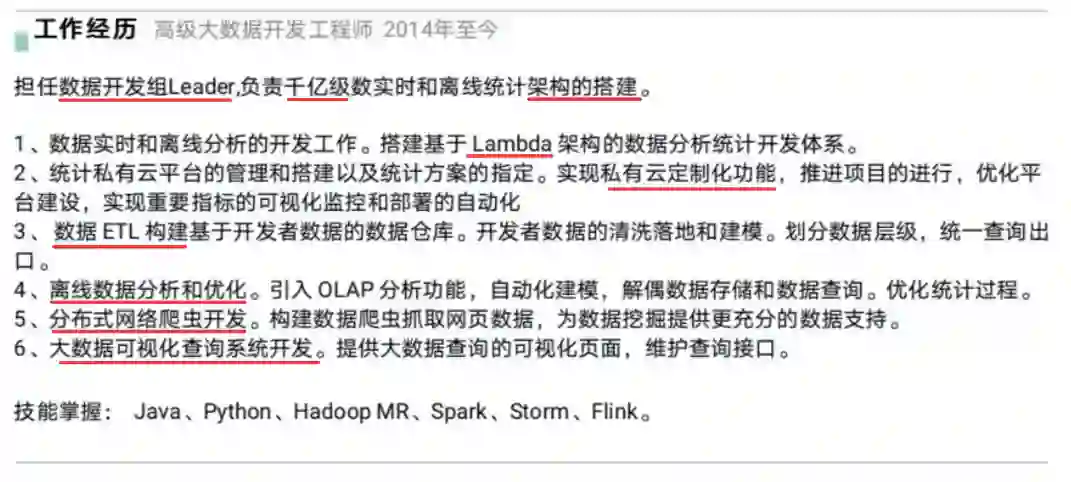 篇幅有限,我截取了一部分他的工作经历。不管你是已经入坑大数据,还是打算转行大数据,都会让你有一些新的启发。