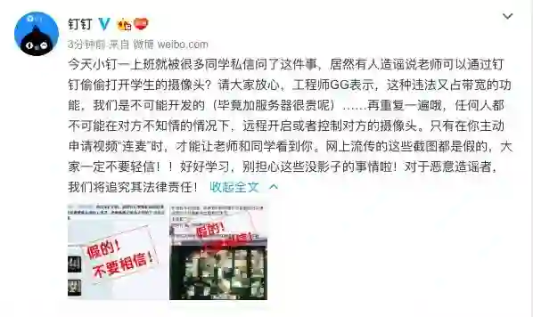 钉钉辟谣“老师能打开学生摄像头”:将追究造谣者责任