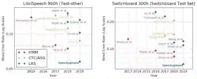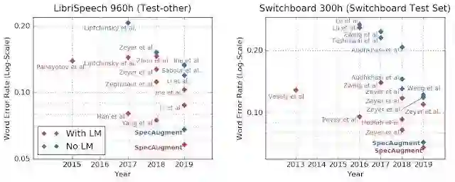 在 SpecAugment 的研究中,作者们意外发现借助 SpecAugment 训练的模型,在不使用语言模型增强的情况下就已经可以击败之前的所有使用语言模型增强的模型。这不仅意味着语音识别模型+语言模型的总体表现也被刷新,更意味着未来语音识别模型完全可以抛弃语言模型独立工作。