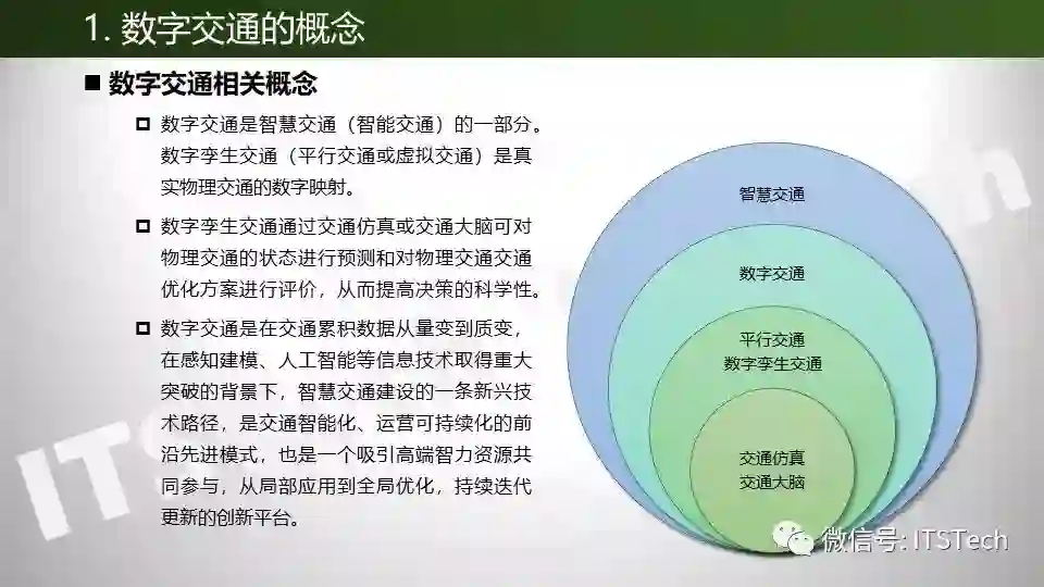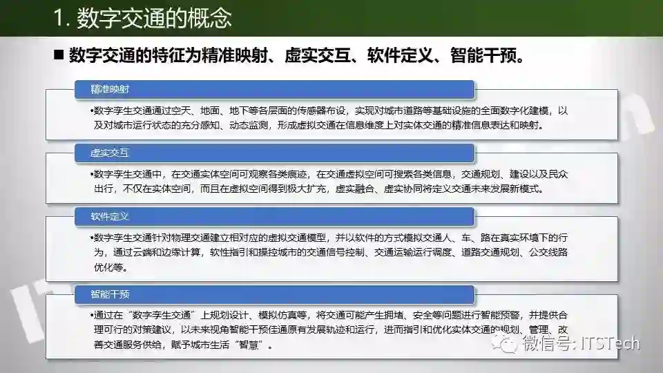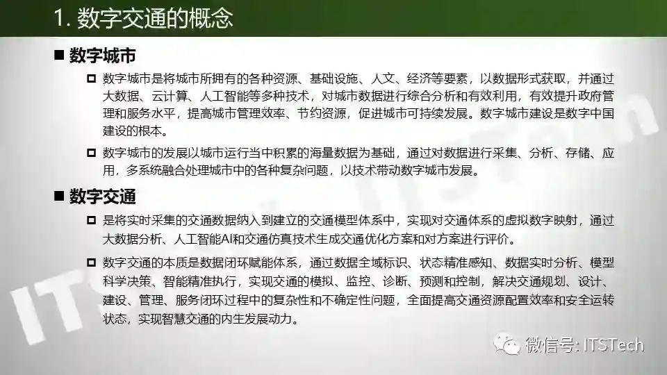 数字交通是将实时采集的交通数据纳入到建立的交通模型体系中,实现对交通体系的虚拟数字映射,通过大数据分析、人工智能AI和交通仿真技术生成交通优化方案和对方案进行评价。