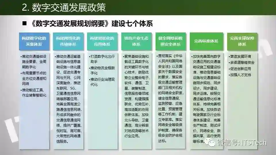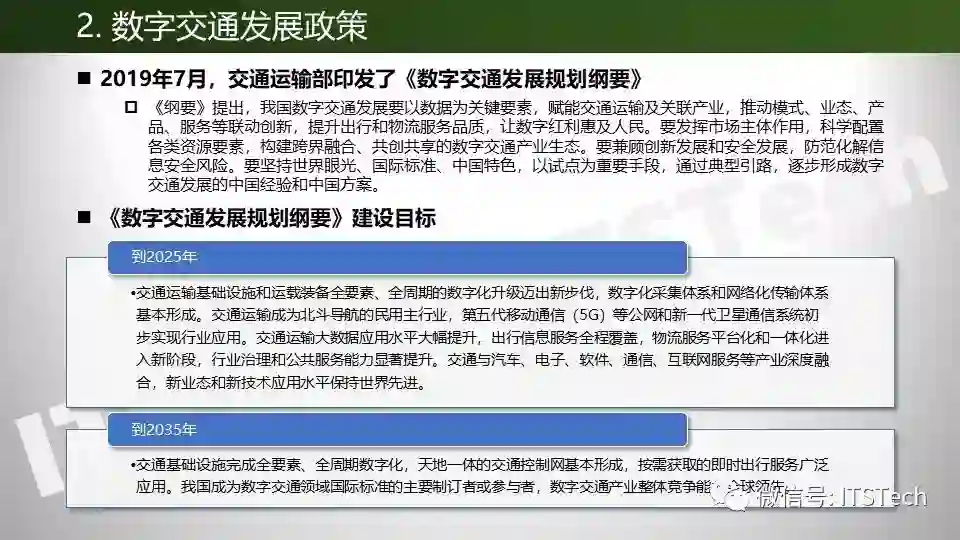 2019年7月,交通运输部印发了《数字交通发展规划纲要》。《纲要》提出,我国数字交通发展要以数据为关键要素,赋能交通运输及关联产业,推动模式、业态、产品、服务等联动创新,提升出行和物流服务品质,让数字红利惠及人民。要坚持世界眼光、国际标准、中国特色,以试点为重要手段,通过典型引路,逐步形成数字交通发展的中国经验和中国方案。