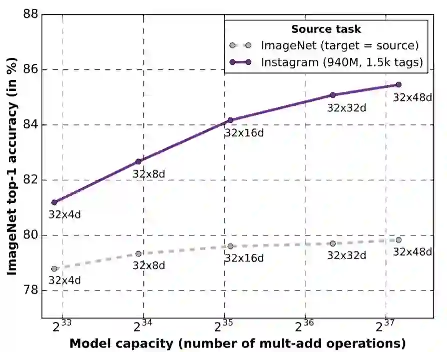 图1:使用不同规模和参数配置的ResNeXt-101模型在ImageNet和Instagram标记数据集的分类性能的比较