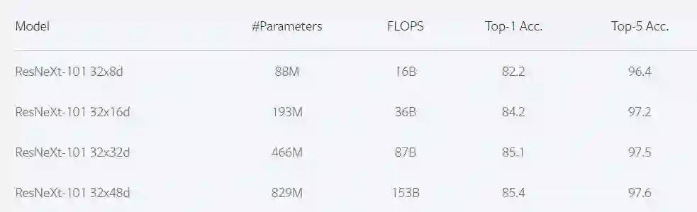 表2:使用不同规模、不同参数配置的ResNeXt-101模型获得的不同性能结果比较