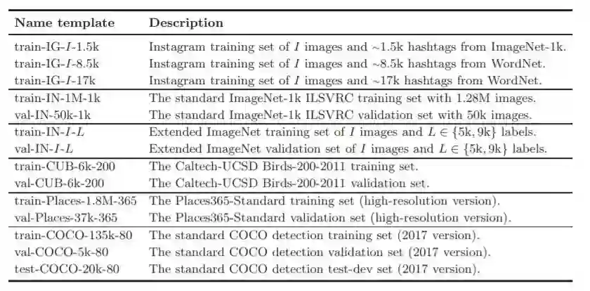表1:图像分类数据集的摘要。每个数据集标明数据来源和功能(训练集,验证集,测试集),图像数量I和标签数量L。