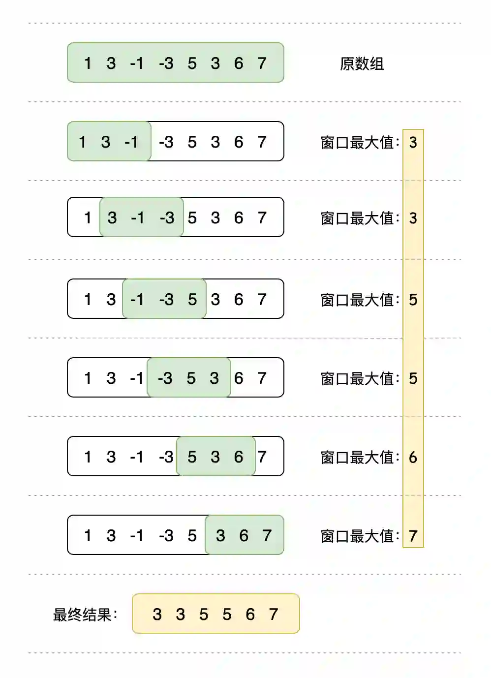 输入: nums = [1,3,-1,-3,5,3,6,7], 和 k = 3 输出: [3,3,5,5,6,7]
