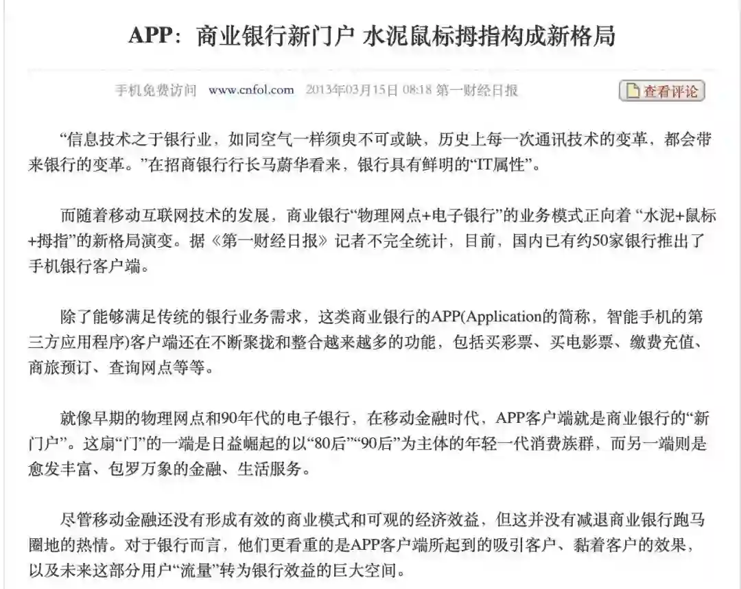 今天,翻到了一篇6年前写的旧文。彼时,正值移动互联网红利爆发的前夜。过去银行物理网点+电子渠道的模式开始转为「水泥+鼠标+拇指」的格局,商业银行App(包括手机客户端、手机银行等)的战略价值刚刚开始发力。