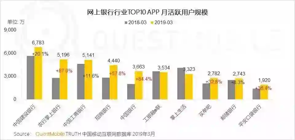 再来看一下活跃度,Questmobile此前公布的数据显示,一季度多家银行的APP月活跃用户规模同比上一年都出现了大幅上涨。