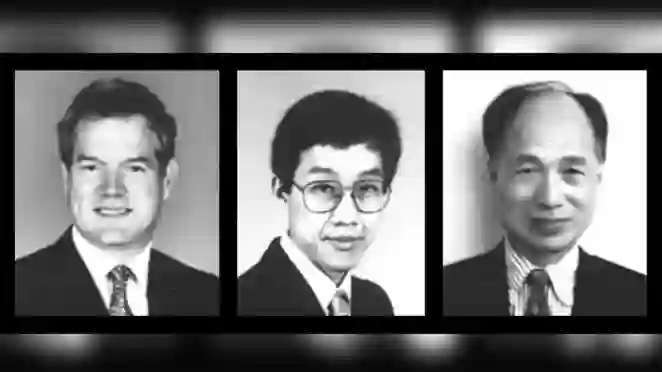 Michael Houghton、朱桂霖、郭劲宏(从左至右),照片拍摄于1990年左右。来源:H. J. Alter & M. Houghton/Nature Med