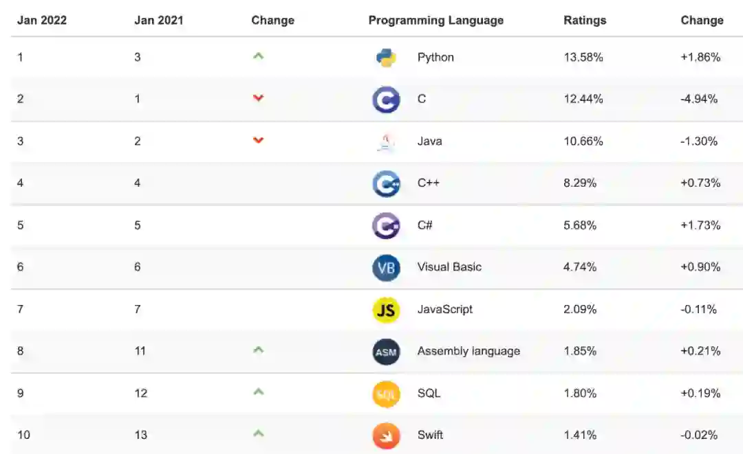 Tiobe 2022 年 1 月榜单中,排名前 10 位的语言是 Python、C、Java、C++、C#、Visual Basic、JavaScript、汇编语言、SQL 和 Swift。