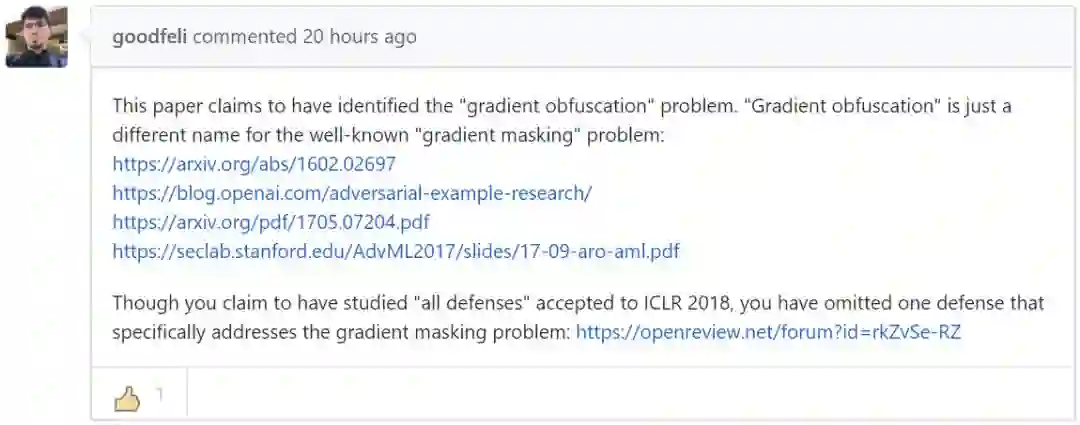 这篇论文甫一出现,立刻引起了研究社区的关注,GAN 提出者 Ian Goodfellow 也参与了讨论。Goodfellow 指出「混淆梯度」的概念实际上与此前人们提出的「梯度遮蔽(gradient masking)」概念相同。同时 ICLR 2018 中的一篇论文《Ensemble Adversarial Training: Attacks and Defenses》(Goodfellow 也是作者之一)实际上解决了这一问题。不过,这一观点并未被 MIT 与 UC Berkeley 的论文作者完全接受。