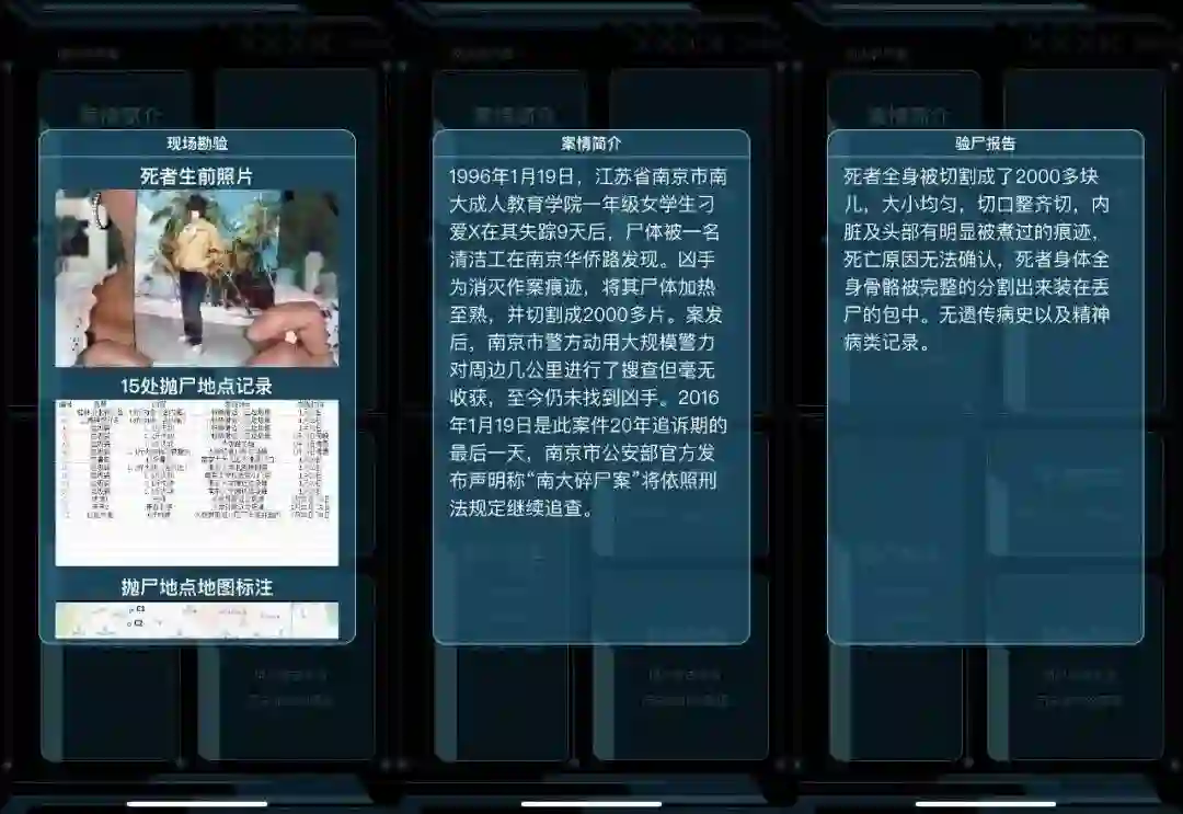 进入真实案件,游戏提供了案情简介、现场勘验、侦查线索、验尸报告、死者信息五块。